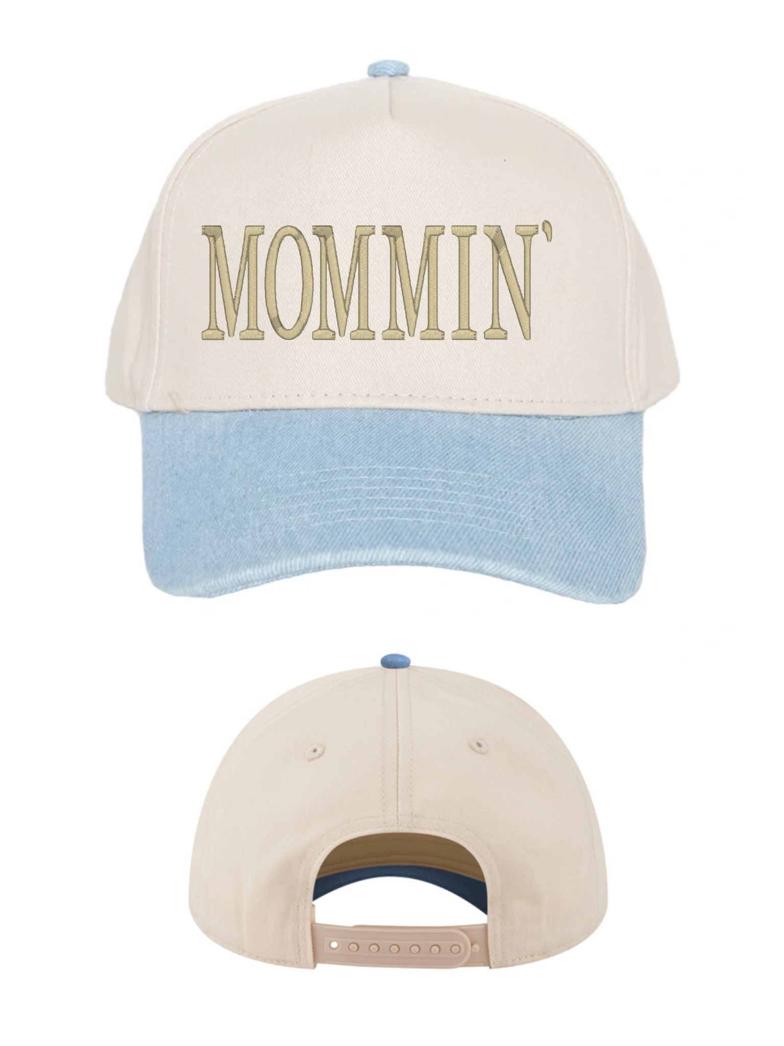 A chic staple for modern motherhood. Our Mommin’ trucker hat blends effortless style with everyday function, featuring a neutral natural crown paired with a light denim coloured brim for the perfect elevated touch.